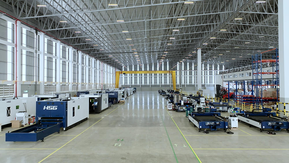 生產區布局40個生產工位,滿足40臺高端切割機同時生產,工廠年產能2000臺激光加工智能裝備,目前主要生產宏山高端板材切割機,如C系列單平臺激光切割機,GX系列雙平臺激光切割機和GH系列高功率激光切割機,未來將不斷結合全球市場需求,研發制造更多機型。